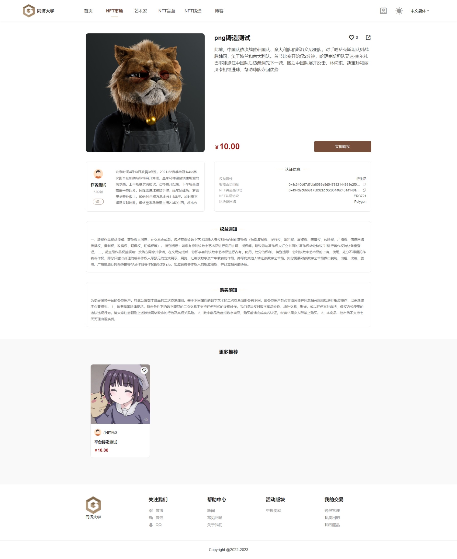 4.显示 NFT 产品缩略图、名称、编号、价格、简介等信息,点击进入对应 商品详情页;详情页显示: 商品多图(或视频) 、文字介绍、hash地址、NFT 编号、 发行数量、剩余发售数量、价格等信息; 下方显示其他热门商品推荐
