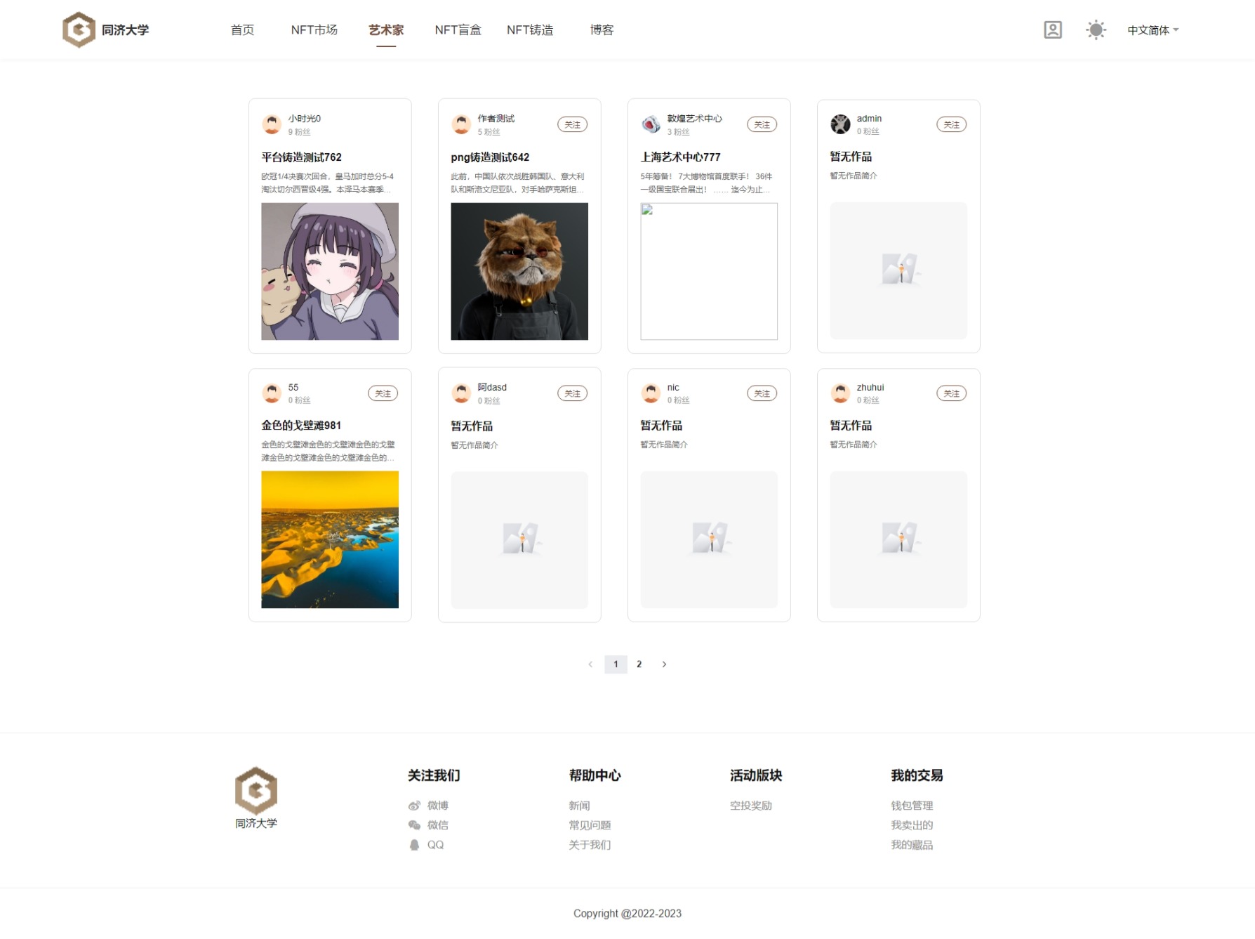 7. 艺术家专栏,在此可以看到对应专栏作者的作品,点击对应专栏,显示作者介绍、作品缩略图、文字介绍、hash地址、NFT 编号、发行者数量、画廊信息等