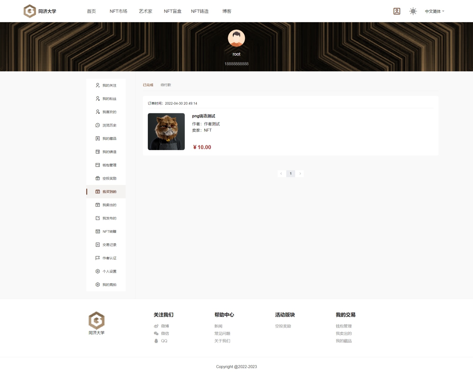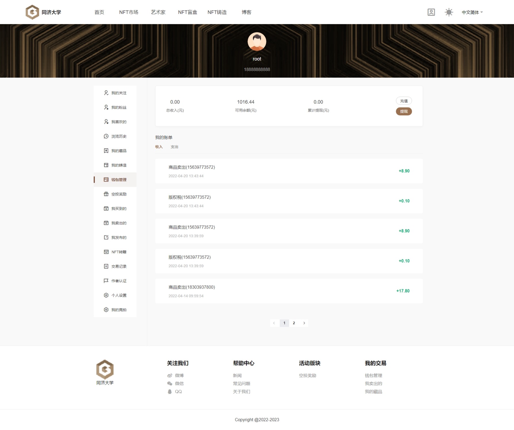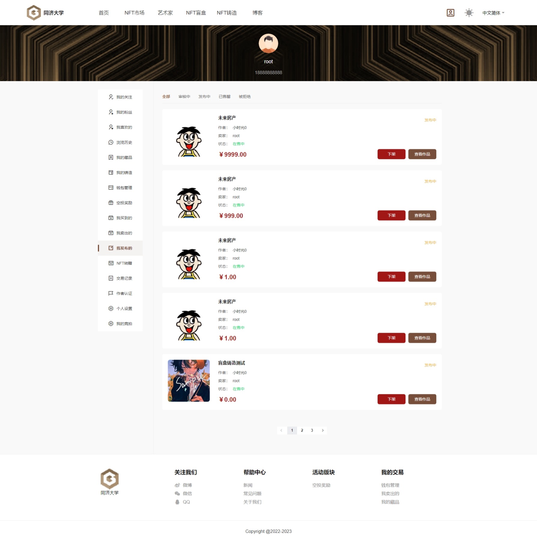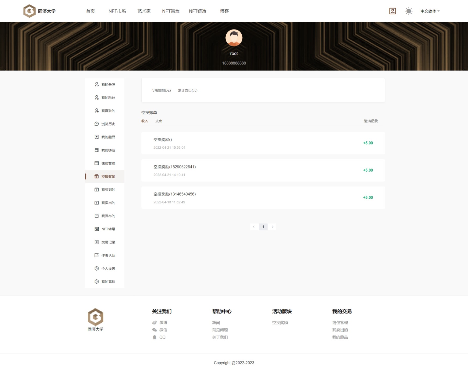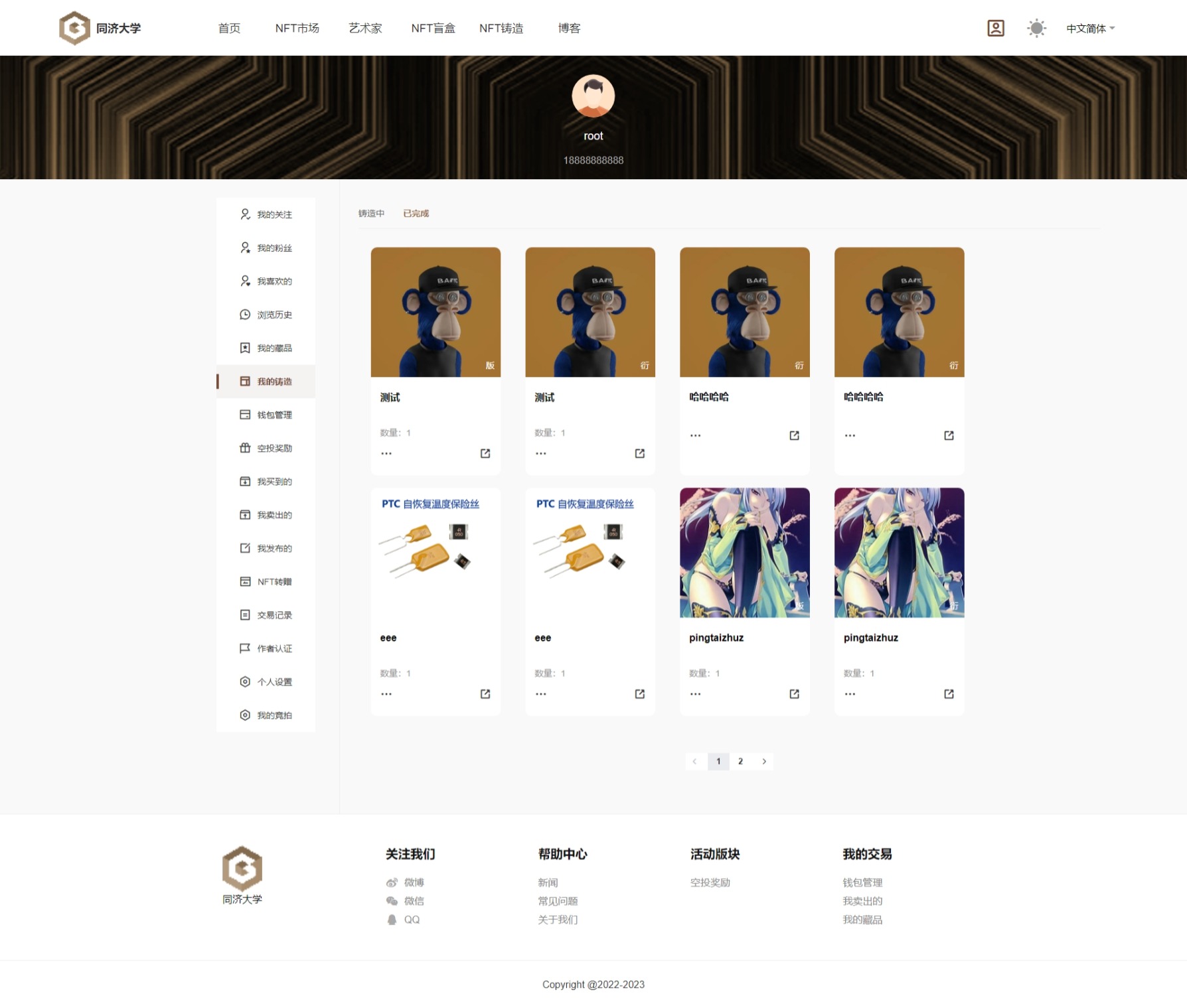 11.个人中心板块:显示购买记录、交易记录、浏览记录、我的藏品、我的铸造、铸造中、已完成、钱包信息、空投记录、邀请记录、拍卖记录、卖出的藏品、买入的藏品等信息;