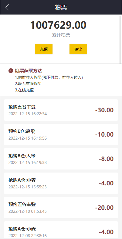 每天抢购交易时间分5个时段,在每个规定时间段内,抢到则能下单,抢不到只能等下一轮,抢不到退回预约粮票。