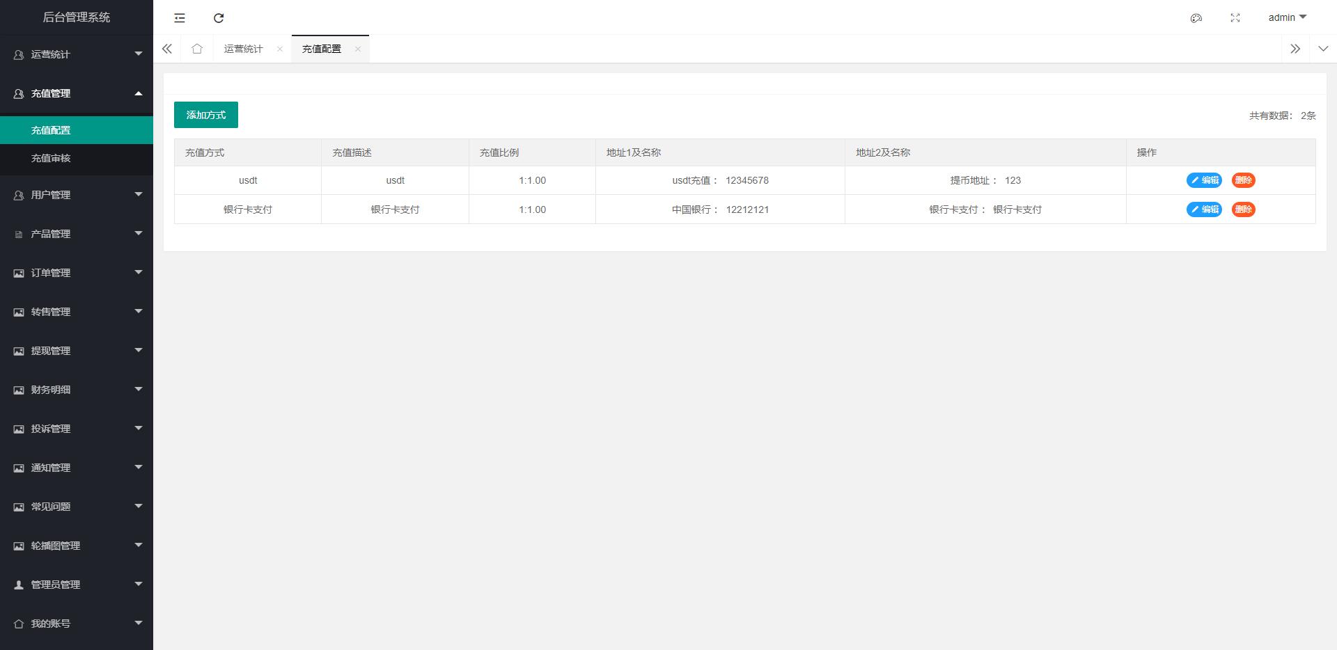 优化部分功能,新增本地银行卡充值方式,后台设置银行卡信息,前端显示信息,并将金额后多两位小数金额,用于识别转账信息确认,后台可根据金额后两位小数点到账金额核对,操作点击确认到账