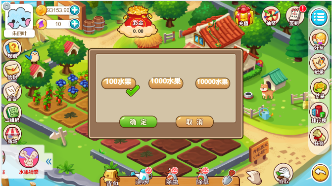5、幸运抽奖:消耗能量抽奖,有机会获得种子金币和能量(转盘上的奖品后台可配置);签到:每日签到;连续签到奖励(后台可设置连续天数和对应的奖励);规则:后台上传修改规则;信封:(后台反馈回来的信息);留言:玩家可以在线留言,后台可以查看;二维码:推广海报二维码;商城:实物产品和现金红包金币兑换好友:平台可以添加好友;被偷玩家显示;下级团队显示;记录:种植收获记录;偷取记录;交易记录;交易:收获的水果和偷取的水果可以在交易列表里挂卖,挂卖可以自己设置挂卖的金额,挂买挂卖进行自行线下交易出售;出售、列表、买入、售出;排行榜:平台增加金币榜,能量榜,果实榜,好友可以互相攀比;任务栏: 任务栏里有每日任务和长期任务,完成可以获得相应奖励