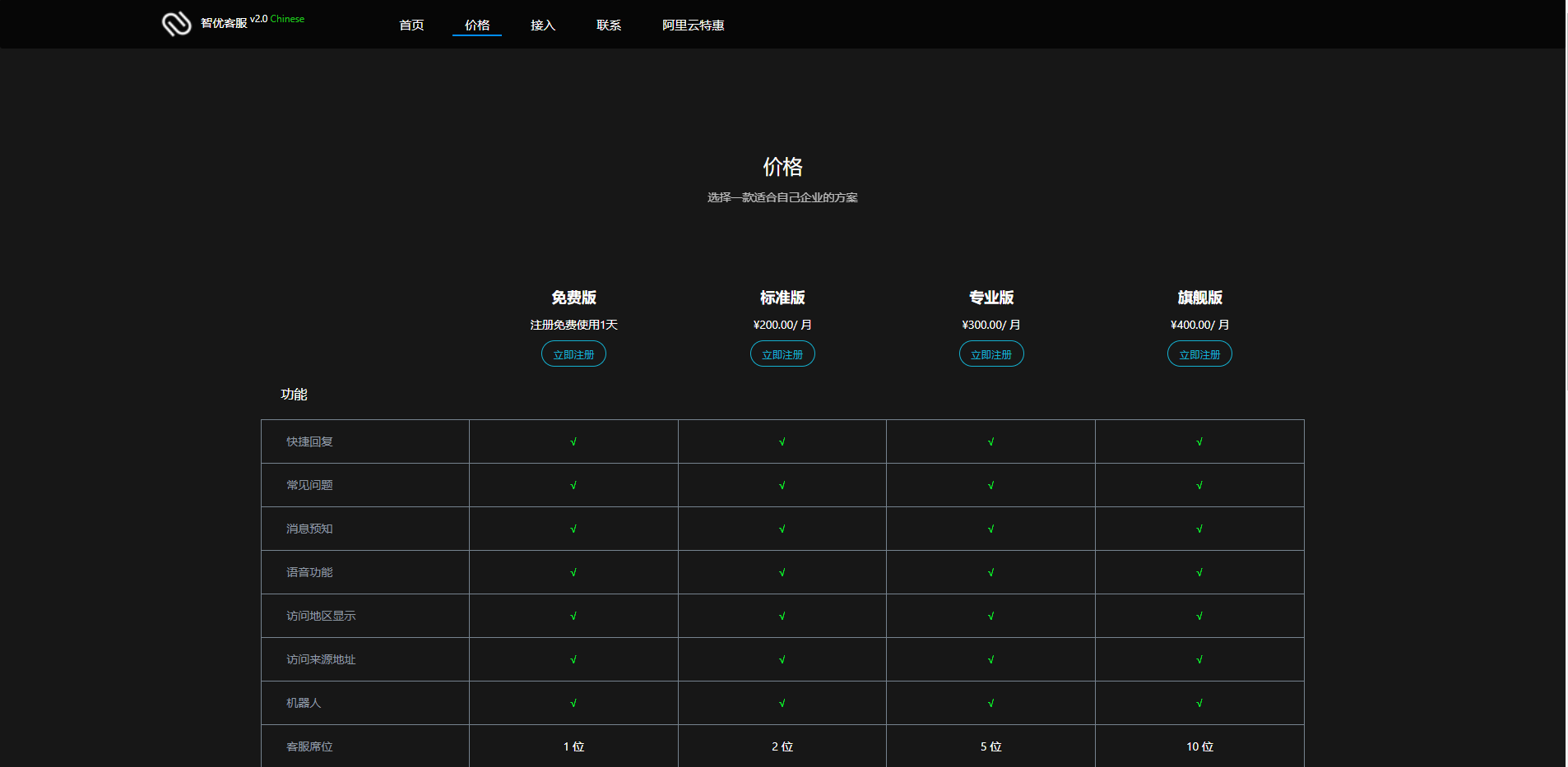 卡密充值,卡密登录,境外短信,支付宝当面付,快捷回复,常见问题,消息预知,消息撤回,消息抖动,语音功能,访问地区显示,访问来源地址,机器人,不限坐席,黑名单功能,留言功能,服务评价,夜间模式,顾客排队,数据看板,多语言切换,一次付费,终身使用,价格仅仅是其它客服系统2-3个坐席一年的价格
