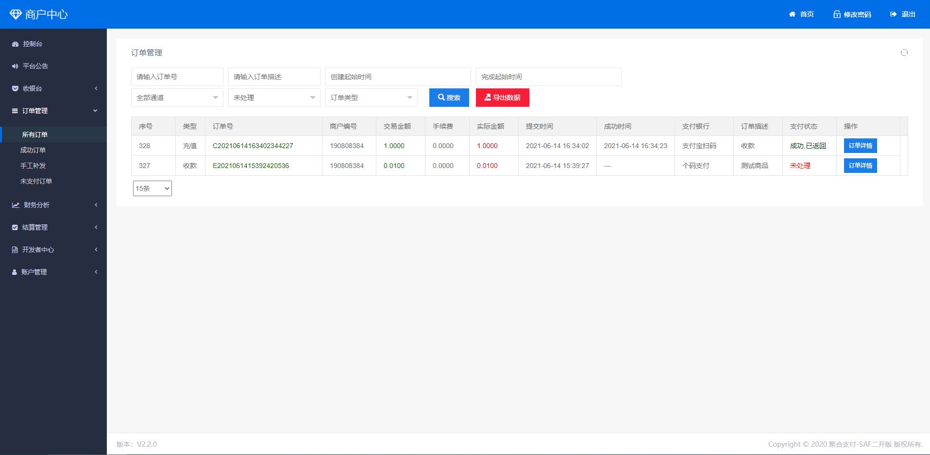 商户中心:收银台(收款二维码+收款链接)、订单管理、结算申请、结算记录、商户代付、代付记录、财务分析、商户认证