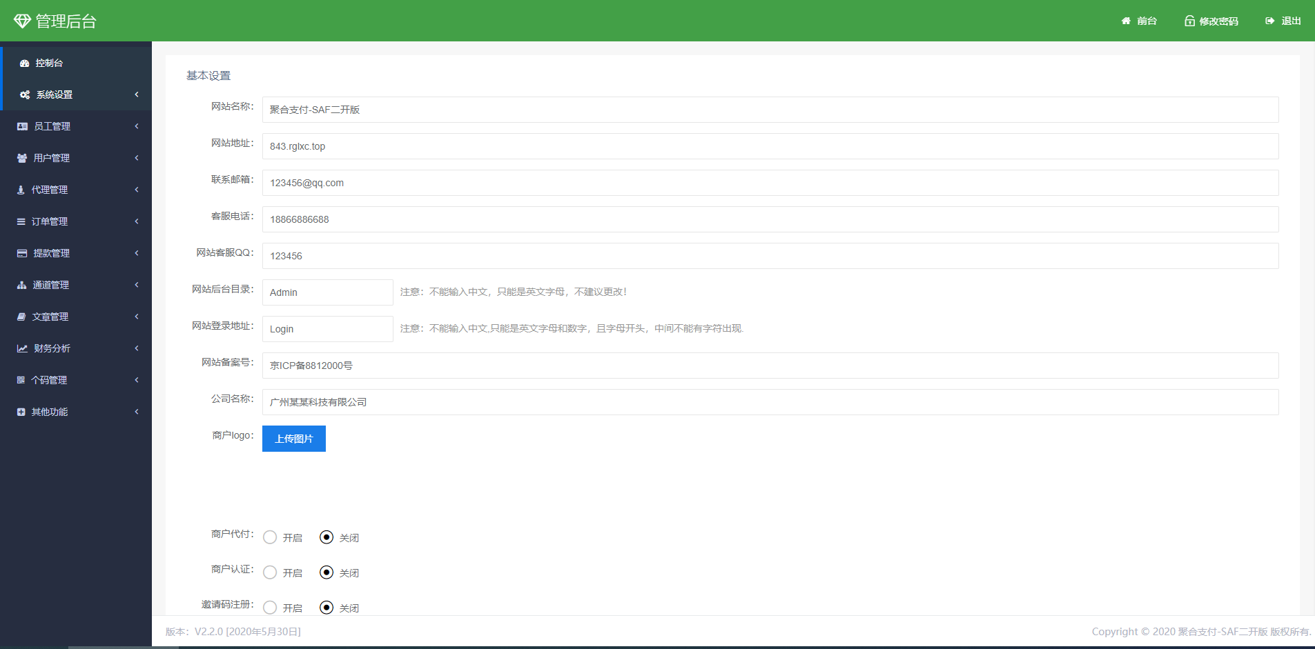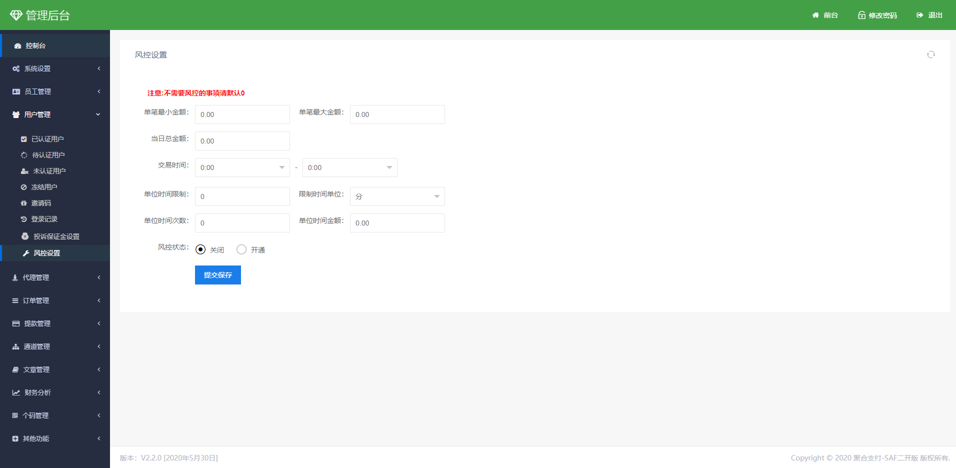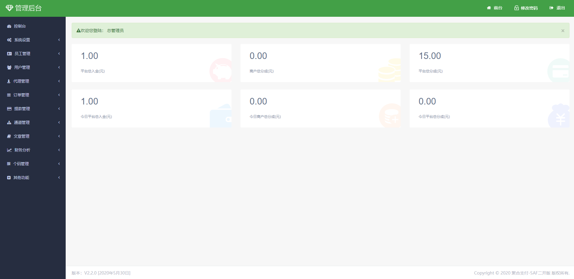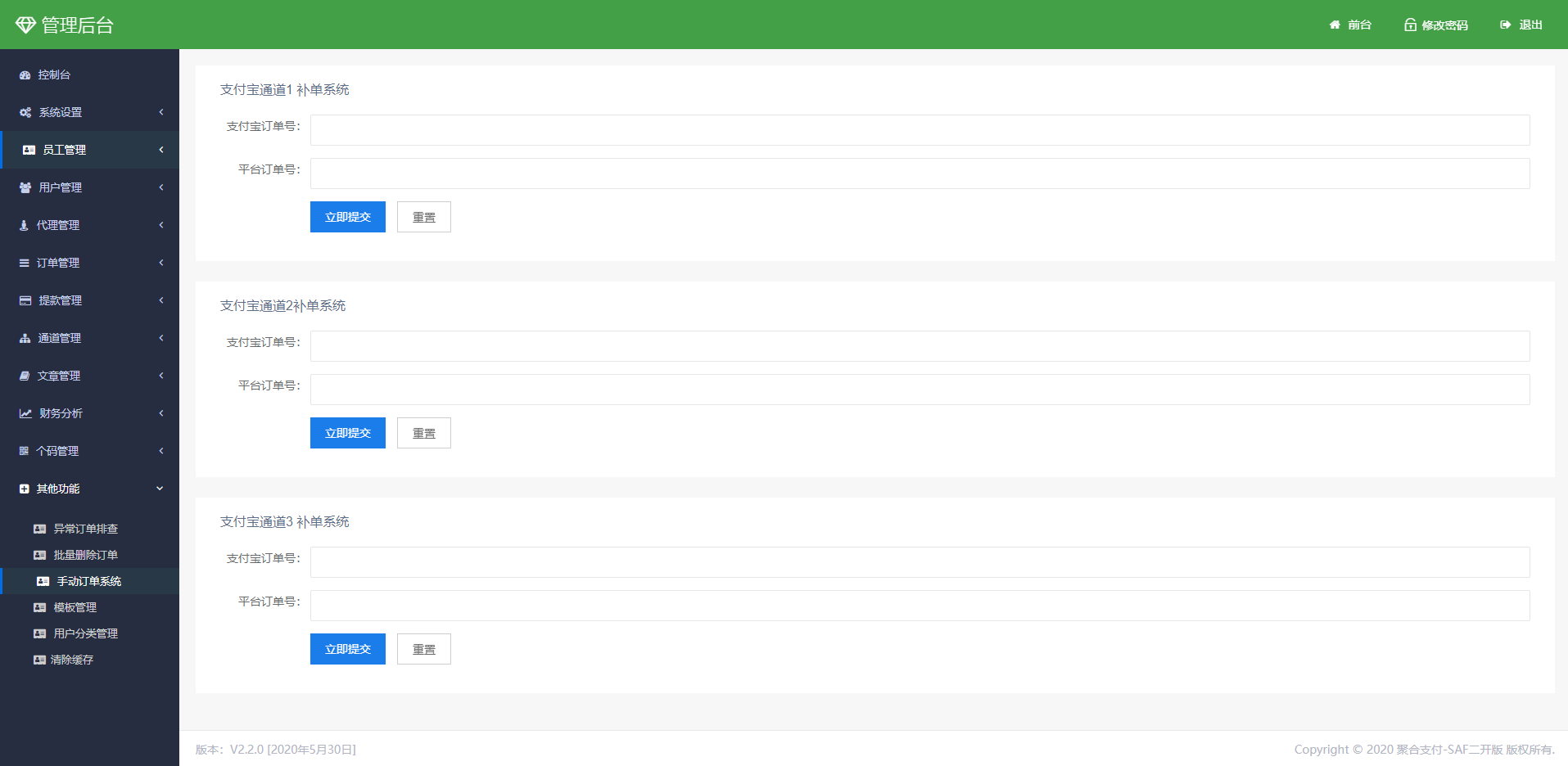 管理后台:风控设置、邮件设置、短信设置、计划任务、数据清理、菜单管理、用户分类管理、员工账号管理、权限配置、用户管理、投诉保证金设置、代理管理、代理佣金记录、订单管理、重新通知、手动补单、手动结算、代付结算、支付产品、入金通道、代付渠道、易支付接口兼容、文章/公告管理、财务分析、个码管理(订单语音通知+手动确认回调)、网站模版、提现语音通知、异常订单排查、手动订单系统等等