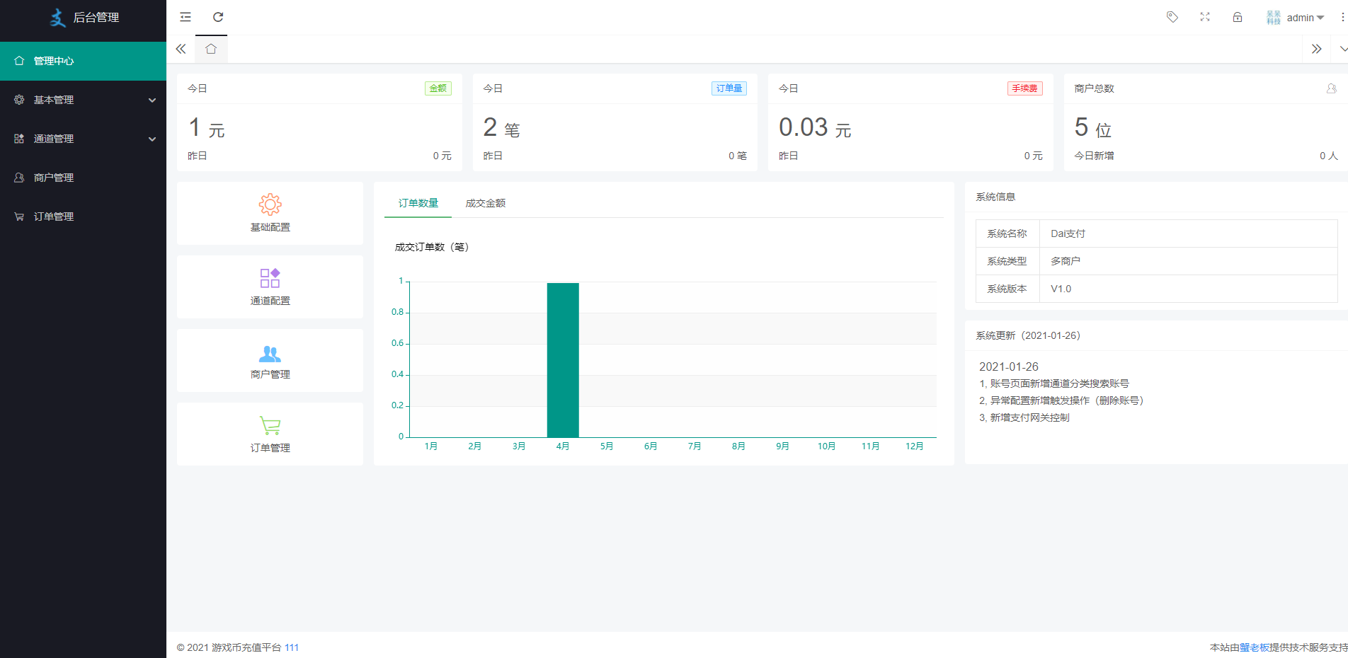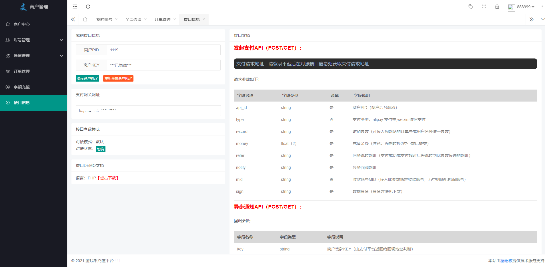 版本特性:全新UI,全新接口,系统为多商户版本,可招商入网,收取费率。回调稳定,抗并发,代码经过整理优化,使用起来稳定顺手