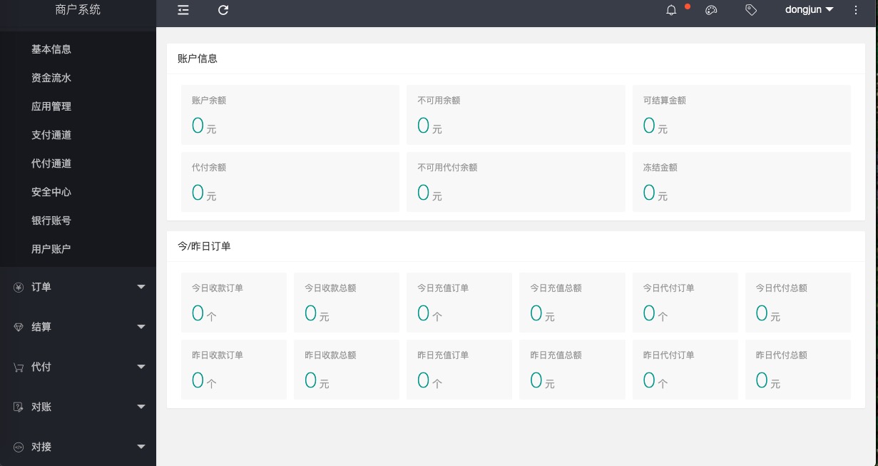 商家后台功能包括商户模块,订单模块,结算模块,代付模块,对账模块,对接模块。商户模块包含:收银台配置,基本信息,资金流水,应用管理,支付通道,代付通道,安全中心,银行账号,用户账户。