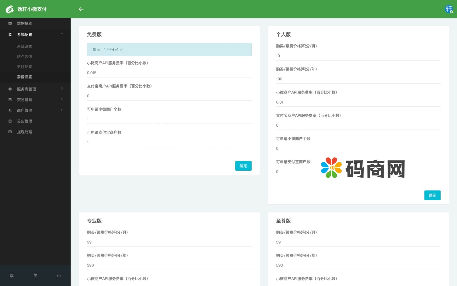 2.后台运营商:在后台添加微信服务商、支付宝服务商,可以添加多个,作为运营商我们的盈利主要靠API手续费,用户使用api会消耗积分,想要低手续费就可以买VIP包月/包年套餐,然后等着用户充值和买API套餐就好了,全程基本不用管,前台用户自己就能搞定,另外作为服务商还有微信和支付宝官方给的返佣,用户交易总额的0.2%-0.8%,就跟推广pos机和刷脸机的一样,只要下面用户消费,我们就有返佣,最容易的赚钱方式。