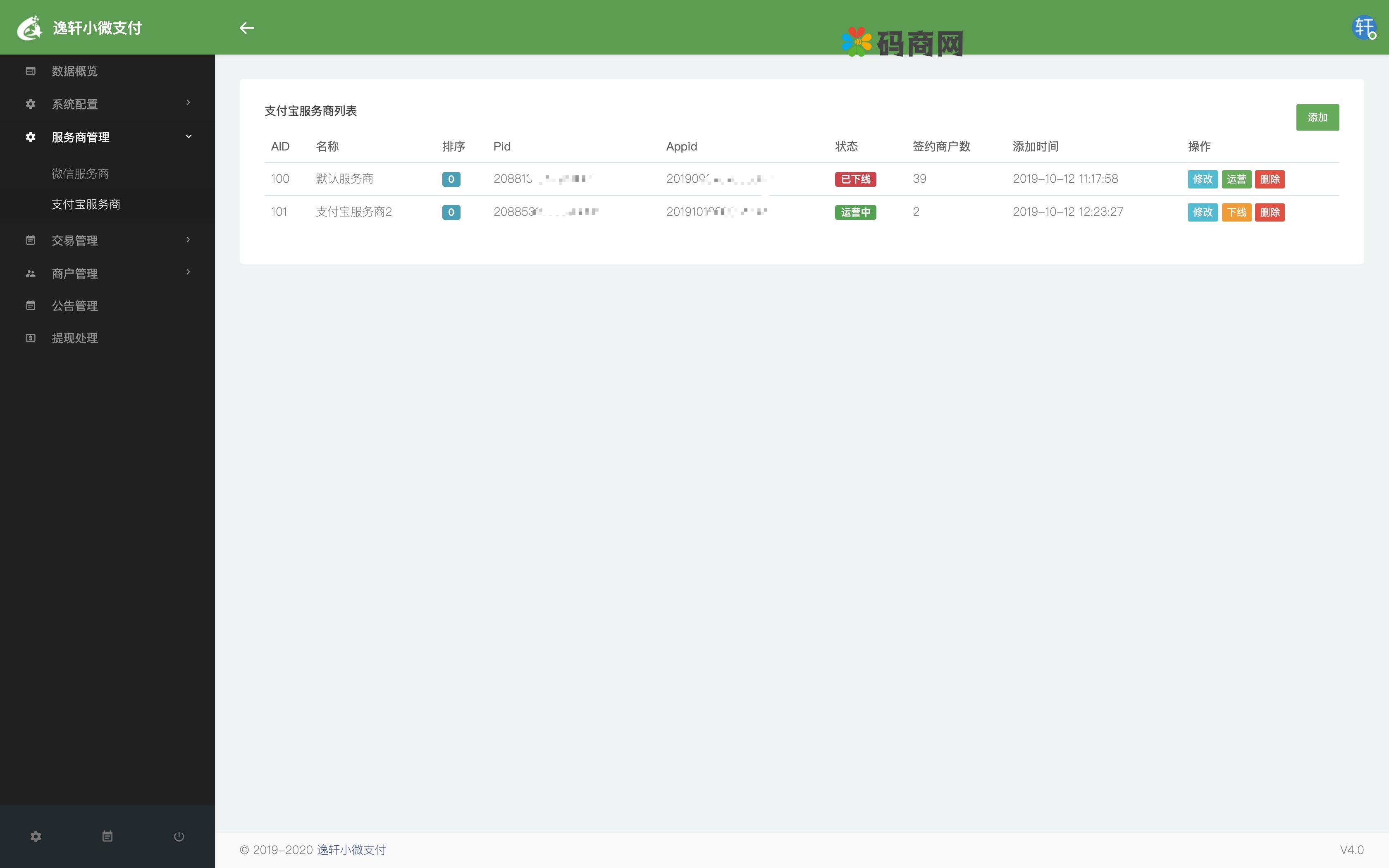 管理后台:数据统计+系统设置+服务商添加/上线/下线/排序+费率/套餐设置+用户管理/商户管理+订单管理+公告/文章+积分/邀请明细+提现处理