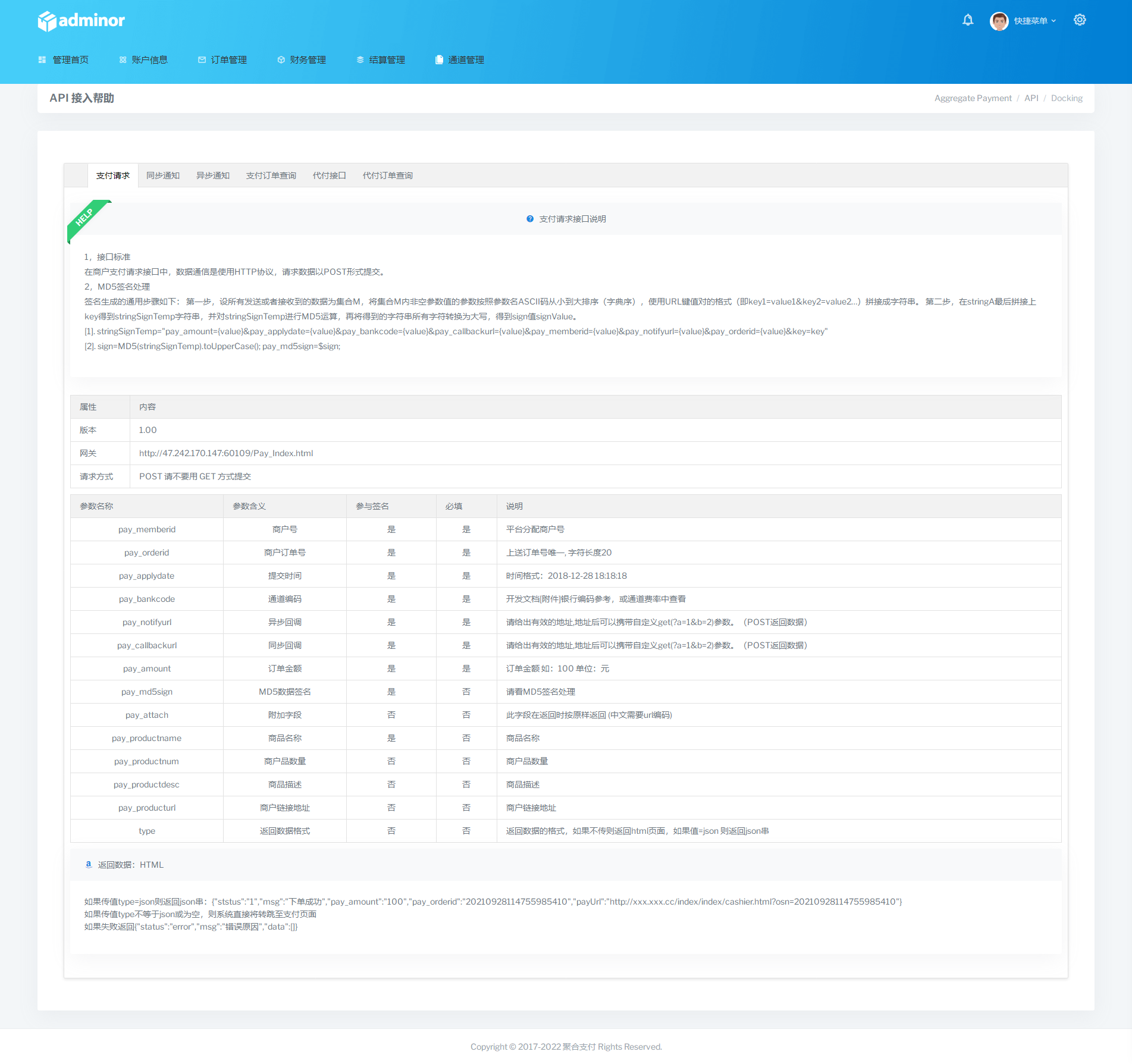 • 文档优化,对接文档重写,现在的文档更加清晰明了,之前是form表单提交的文档,由于现在市场基本上都是需要返回json串的,所以过去的方式已经不太适用,文档已经修改,技术员在对接上游通道时,必须要按照统一格式来对接。