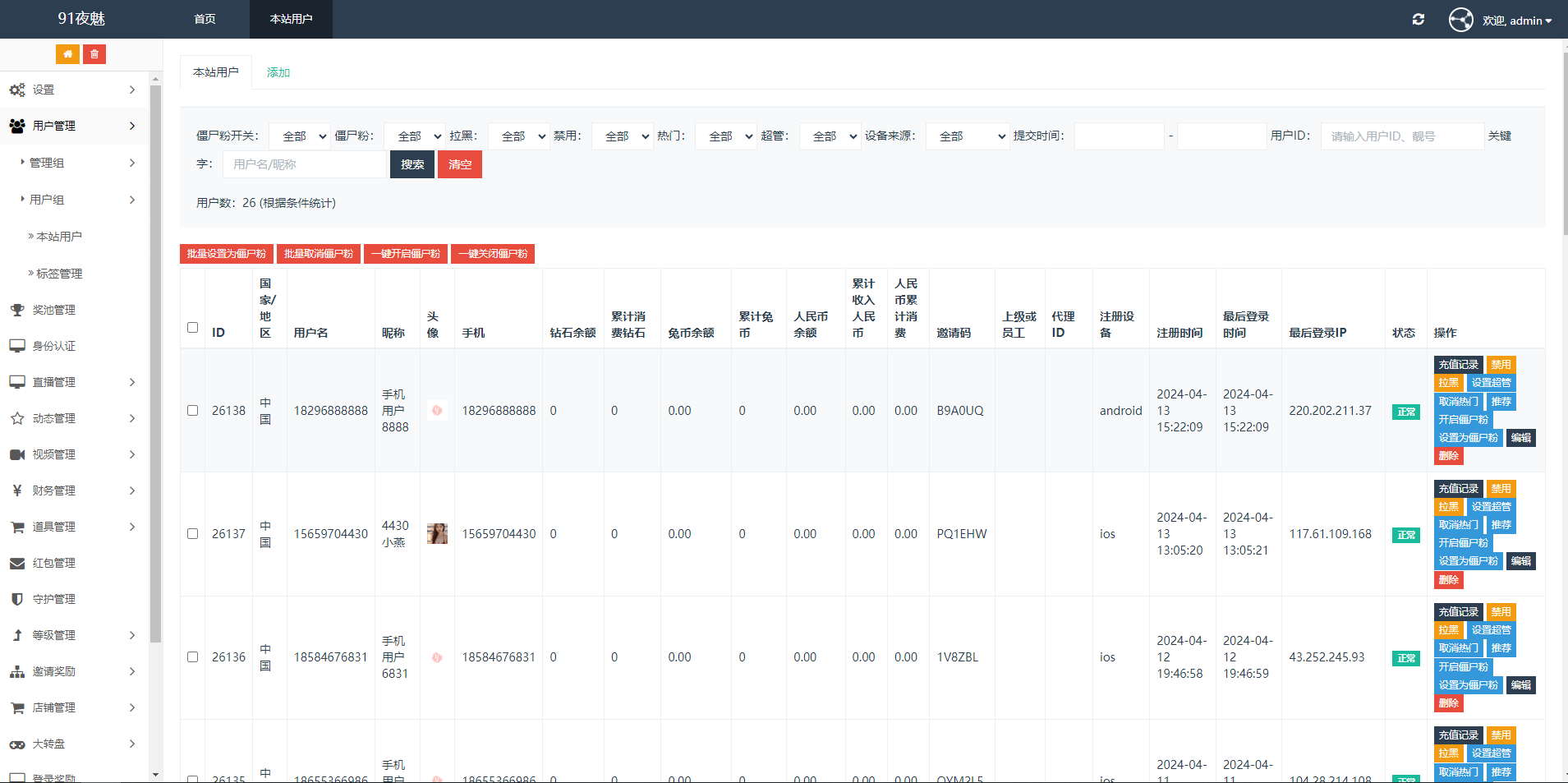 用户端:编辑个人资料、认证主播、钱包充值、勿扰模式等